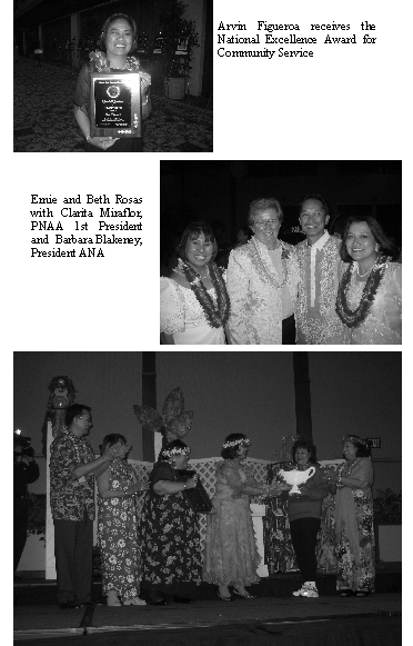 Continued from page 1…..PNAA Silver Jubilee and ending with our delegates inviting everyone by presenting a whimsical but clever top 10 reasons why they should attend the next 2005 PNAA national convention in Kansas City. During the dinner dance gala, the newly elected 2004-2006 PNAA officers and Board members were inducted to office with Ernesto Rosas as Auditor and Rizvend Pecana as Board Member and appointed Regional Liason Officer of PNAA North Central. The PNAA National Excellence Award were presented to Arvin Figueroa as Community Service Nurse on the Year and to Tess Laorunagroch as Clinical Nurse of the Year. We are a very proud of our deserving members for their outstanding achievements and contributions to the nursing profession. Ho' okele ia keia mua aku e ka wa i hala ! Our future is guided by our past! The past has brought hundreds of delegates from all the chapters to attend this national convention with the theme; "Reflections of the past 25 years and visions of the future." Convention topics discussed included :