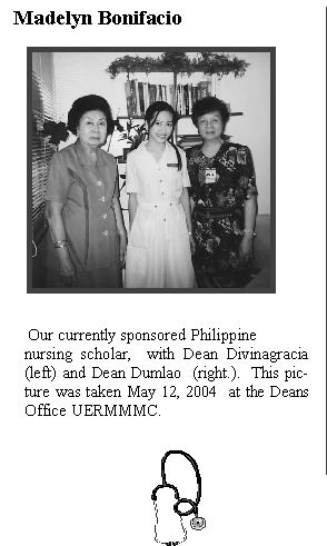 Welcome new arrival: Agripina Catapusan, a registered nurse from Cebu, Philippines arrived in Kansas City on August 6, 2004. She is sponsored by Global Scholarship Alliance to complete her graduate studies at KUMC.