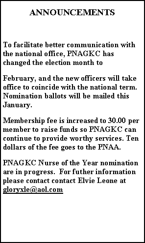 In addition, the national nursing awards will be given on the gala night. It is time for PNAGKC members to nominate another member for the PNAA National Awards in five categories. In the past, Ernie Rosas (nurse entrepreneur), Phoebe Williams (nurse researcher), and Cora Zamora (community service) have won. Past winners are ineligible to be nominated again in a different category. PNAGKC has members who are qualified and deserving to receive the national awards. Call Tess (816- 746-3812 ) for nomination forms and criteria. The awards are in these categories: clinical nurse, nurse administrator, nurse researcher, nurse educator, community service, and nurse entrepreneur.