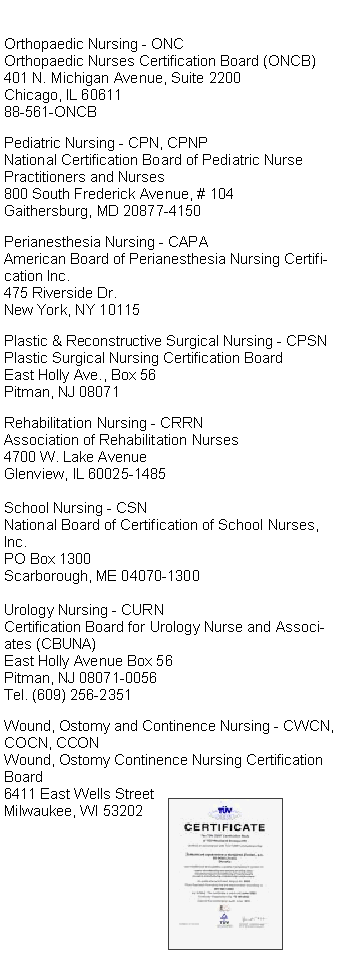 Continued from page 5 …. Certification Maternal/Child Nursing - RNC National Certification Corporation for the Obstetric, Gynecologic and Nursing Specialties 645 N. Michigan Ave., # 900 Chicago, IL 60611 MEDICAL-SURGICAL REGISTERED NURSE - CMSRN Academy of Medical-Surgical Nurses (ASMSN) Medical-Surgical Nurse Certification Board (MSNCB) AMSN Certification c/o C-NET 6401 Pavonia Avenue, Suite 201 Jersey City, NJ 07306 Neuroscience Nursing - CNRN American Board of Neuroscience Nursing Professional Examination 224 N. Des Plaines, # 601 Chicago, IL 60661 Nurse Administration-Long-term Care - CDONA/LTC NADONA/LTC Certification Registrar 10999 Reed Hartman Hwy., # 233 Cincinnati, OH 45242-8301 Nurse Anesthetist - CRNA Council on Certification of Nurse Anesthetists 222 S. Prospect Ave. Park Ridge, IL 60068-5790 Nurse Midwifery - CNM ACNM Certification Council, Inc. 8401 Corporate Drive., # 630 Landover, MD 20785 Occupational Health Nursing - COHN, COHN-S American Board for Occupational Health Nurses, Inc. 630-789-5799 201 East Ogden, # 114 Hinsdale, IL 60521-3652 Oncology Nursing - AOCN, OCN Oncology Nursing Certification Corp. 501 Holiday Drive Pittsburgh, PA 15220-2749 Ophthalmic Nursing - CRNO National Certifying Board for Ophthalmic Registered Nurses 655 Beach St., PO Box 193030 San Francisco, CA 94119