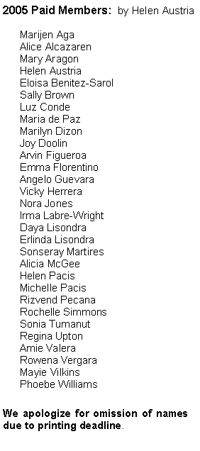 Marifi is originally from Manila and graduated at Our Lady of Fatima in 1993. She settled in Cebu after marrying Conrad and they have a seven year old son, CJ. She worked at Valenzuela District Hospital before accepting the scholarship. Daisy is originally from Mindanao and graduated at Mindanao State University in 1995, and worked for three years in the Middle East . Daisy is married to Edgar and they have two children. Timothy James is 5 years old and Tricia Julienne is 2 years old.