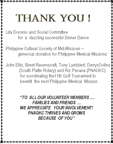 July 11-15 28th PNAA Annual National Convention Anaheim California info: www.Philippinenurses.org August 11 Health Fair at Cultural Center August 31-Sept. 2 Annual Camping October 11- 19 Medical Mission to Samar Oct. 27 Halloween Party November 23 Feed the Hungry Drive Dec.15 Christmas Party