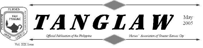 On July 13-17, 2005, the Philippine Nurses Association of Greater Kansas City, will host the 26th PNAA annual convention at the Hyatt Regency, Kansas City Missouri. The theme of the event is Creating Partnership for a Preferred Future ,Sharing Vision, Values and Leadership. We have invited brilliant and experienced speakers to discuss several issues that affects nursing today and its future. Among the topics that will be addressed are the demands of maintaining professional proficiency, keeping up with the latest technology, the influx of foreign trained nurses , building and sustaining a positive partnership in the workplace, the increasing and diverse needs of the clients we serve, building partnership and leadership, the uncertainty of and the future of nursing. We are optimistic that this event will, revitalize , invigorate and empower nursing practice. There will be lots of fun time too! The Convention Planning Committee members with chair, Ernesto Continued on page 5