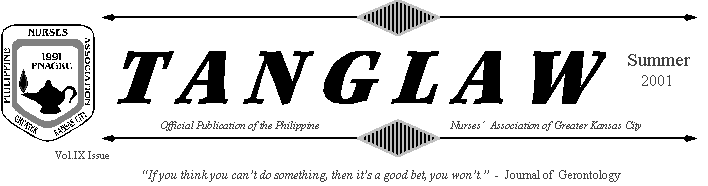 ciation was organized. So far, she has given ten years of volunteer work for fundraising, medical missions, community services, and organizing as well as keeping the PNAGKC survives. She has led the association (1996-1998 President) competently and artistically, exhibiting nursing expertise and leadership qualities, as well as raw talents such as singing, dancing, decorating, cooking, acting, and guitar playing.